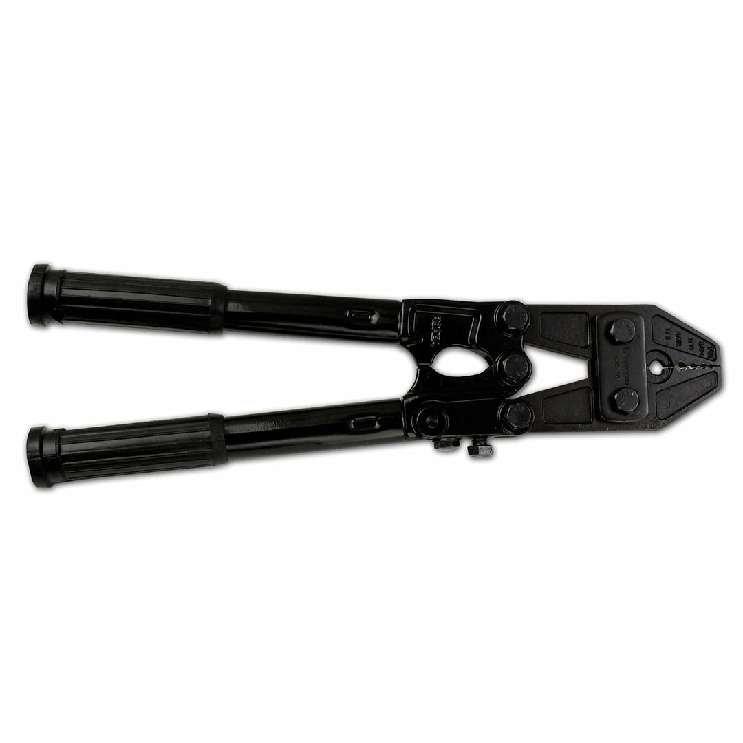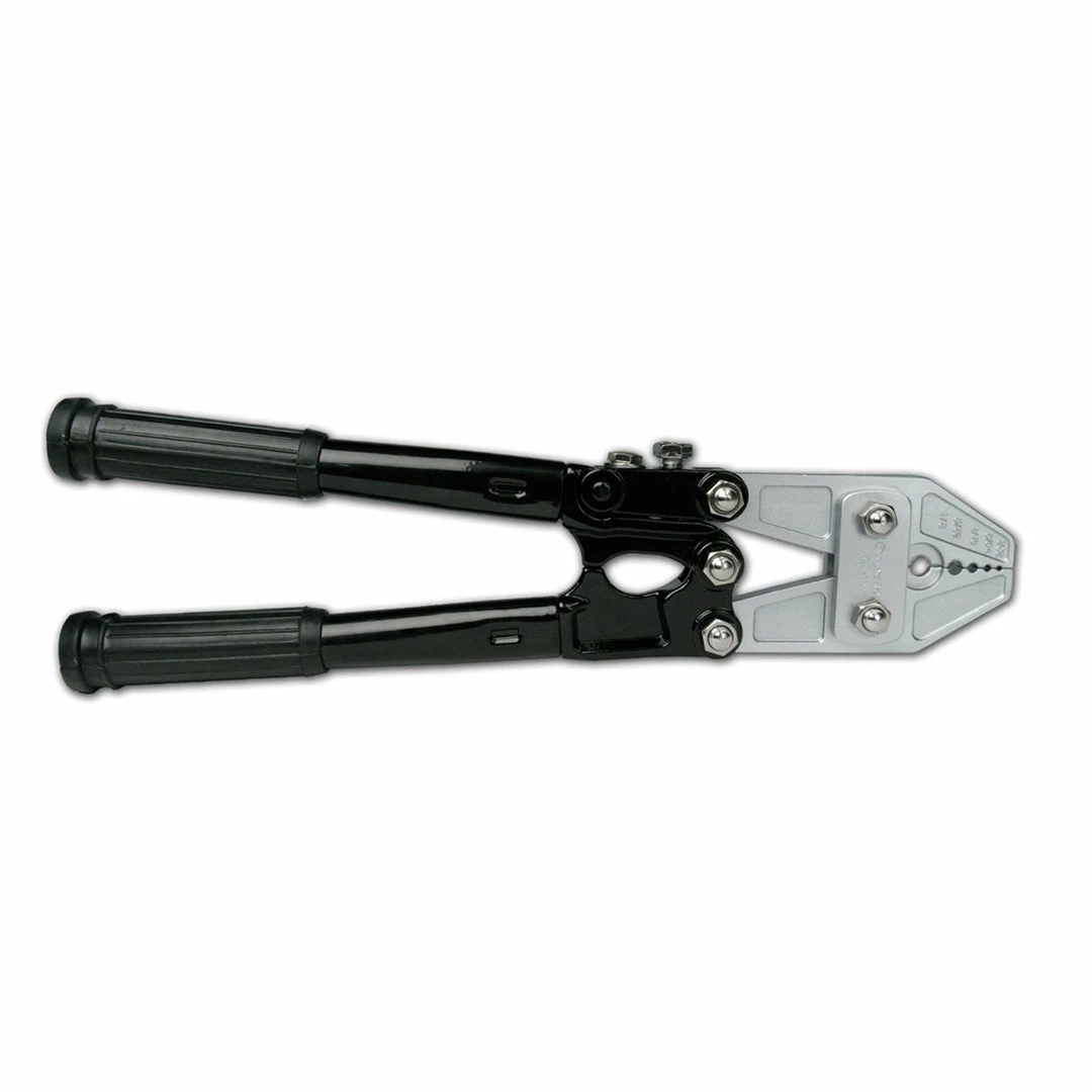 This professional adjustable hand swager will handle crimps from 1.0mm to 4.2mm with ease. Tool is sixteen inches long with non-slip grips. Crimping head has five fixed positions. Deluxe model features heat treated satin finish on jaws, chrome plated hardened bolts and black epoxy finished handles