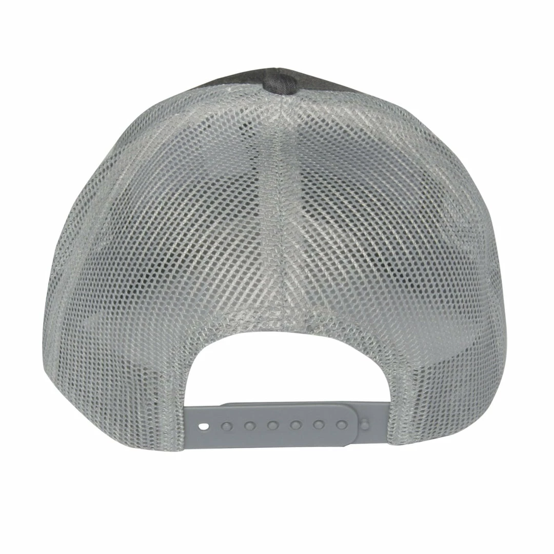 You’ll clean up nicely when you wear this hat. Six panel mesh cap with charcoal heather gray crown and brim and gray mesh. Etched leather patch up front and adjustable snap back closure.