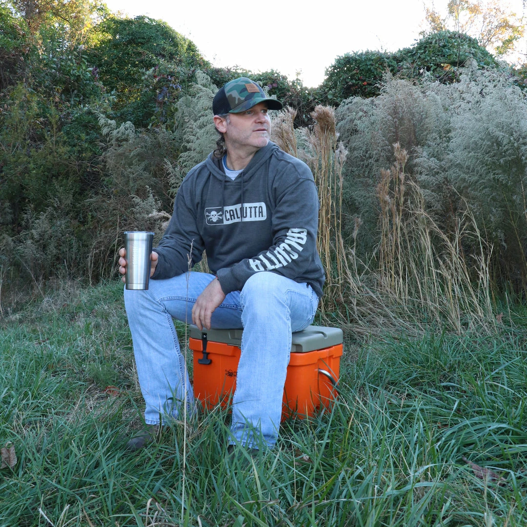 Super-soft, lightweight tri-blend hoodie. Heather gray with classic Calcutta logo on front chest and name on arm.
