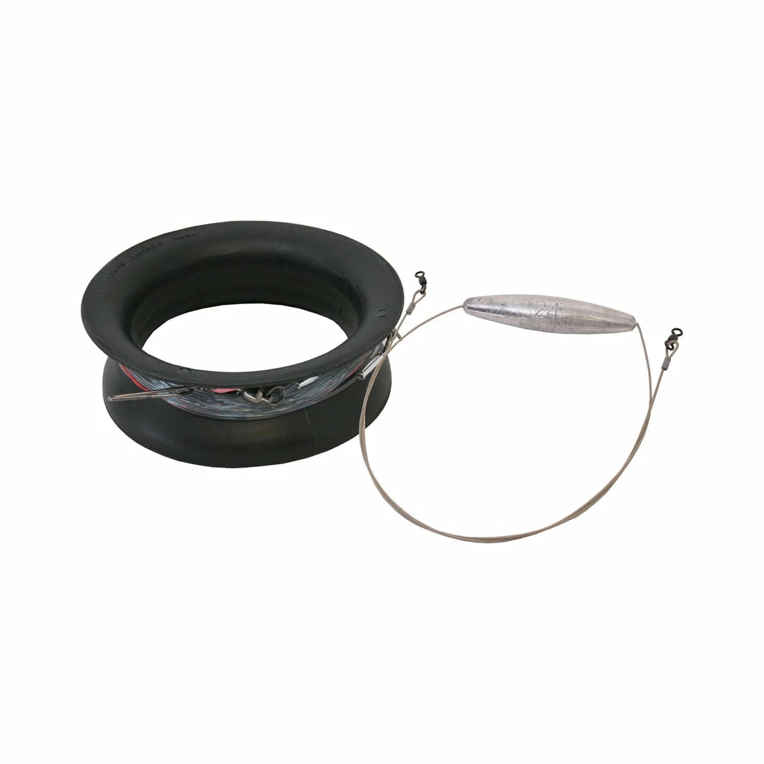 Includes yoyo to keep gear spooled on. Also includes storage bag. 24oz trolling lead rigged on 150 lb cable. 25 feet of 150 lb mono leader.