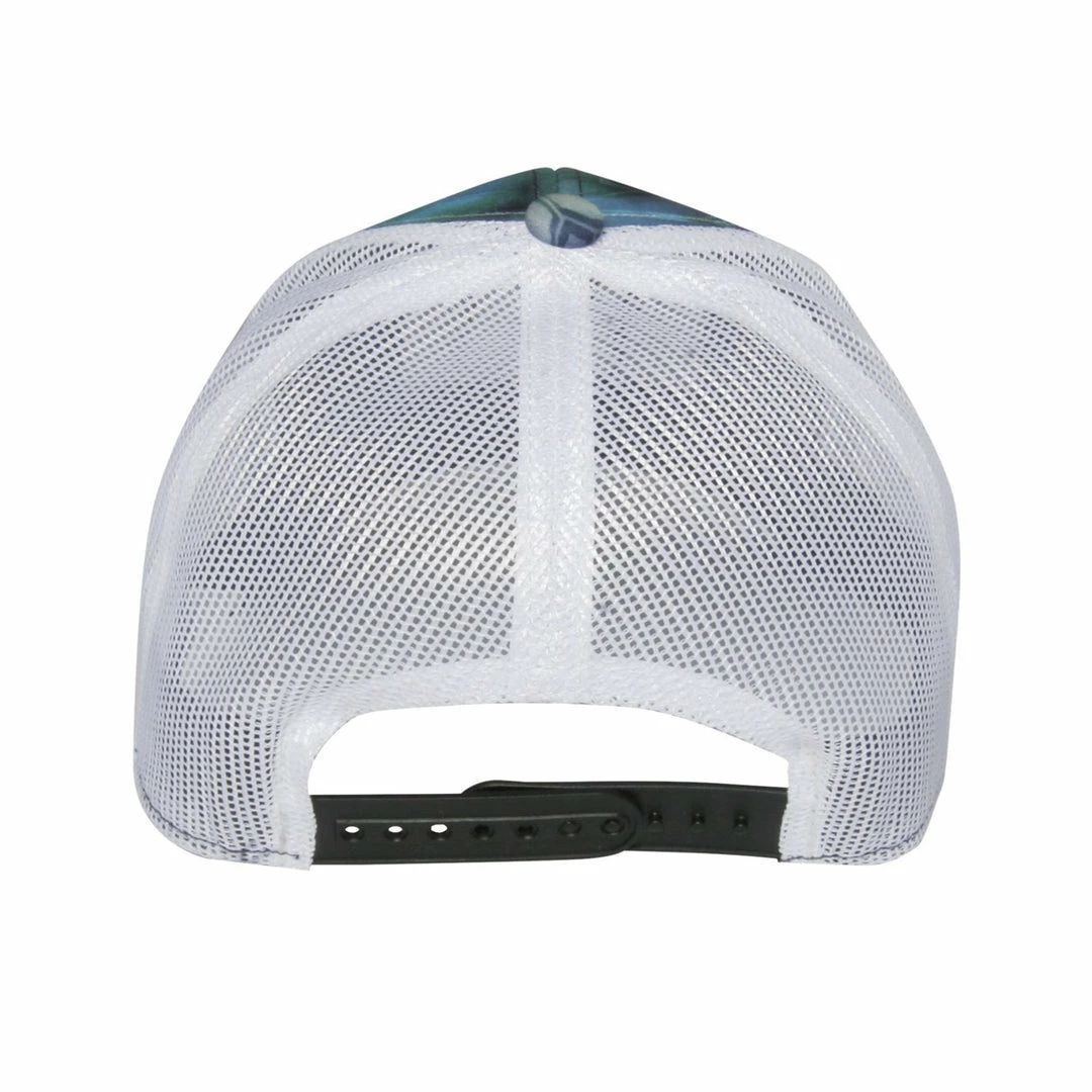 Six panel mesh cap with Kryptek Pontus camo pattern on crown and brim, black under brim and white mesh. Woven sailfish patch up front and adjustable snap back closure.