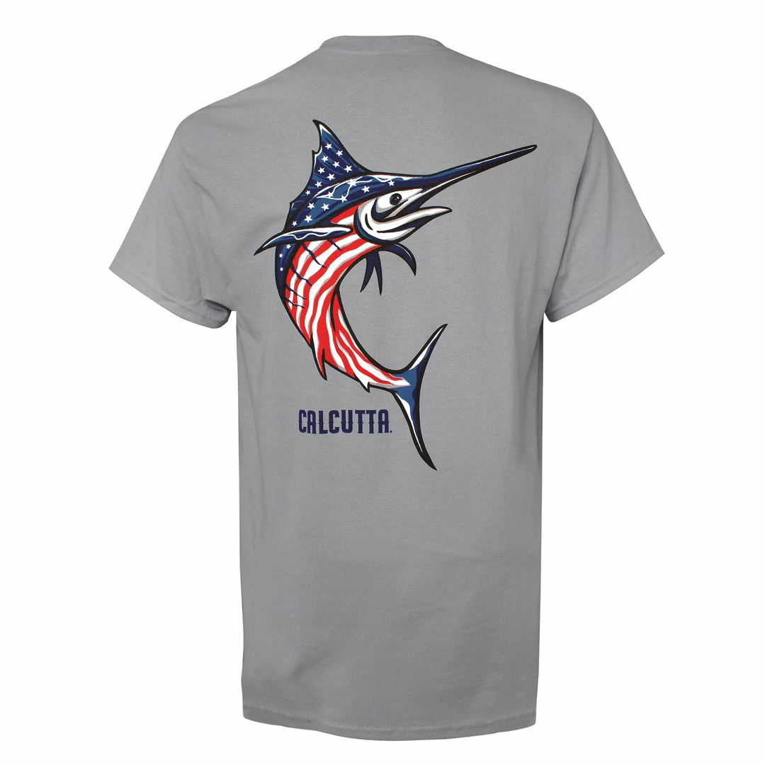 Show your love for the red, white and blue in this super soft short sleeve t-shirt with a stars and stripes marlin.