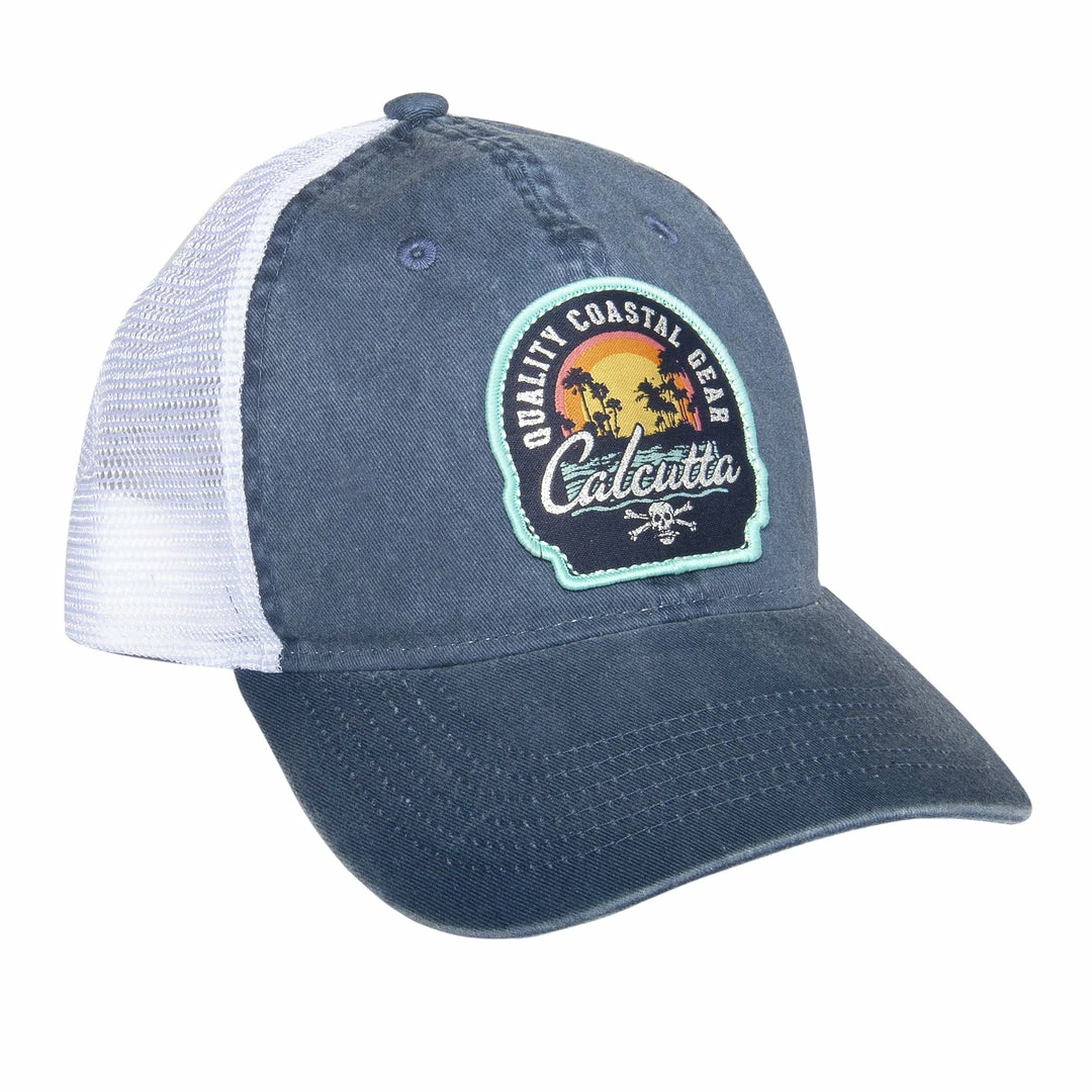 Woman’s six panel mesh cap with blue crown and brim and white mesh. Woven artwork with metallic thread up front and adjustable snap back closure.