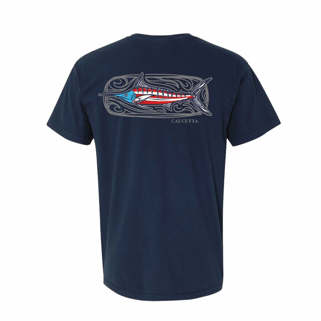 Red white and blue marlin design on navy shirt.