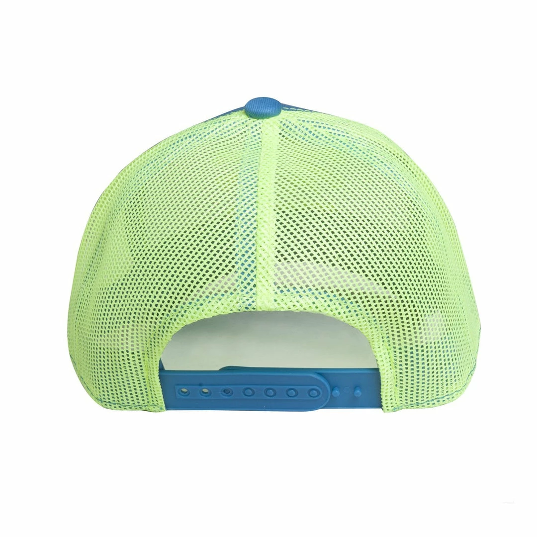 Youth six panel mesh back hat in neon blue with lime green mesh and embroidered classic Calcutta logo. Adjustable plastic closure.