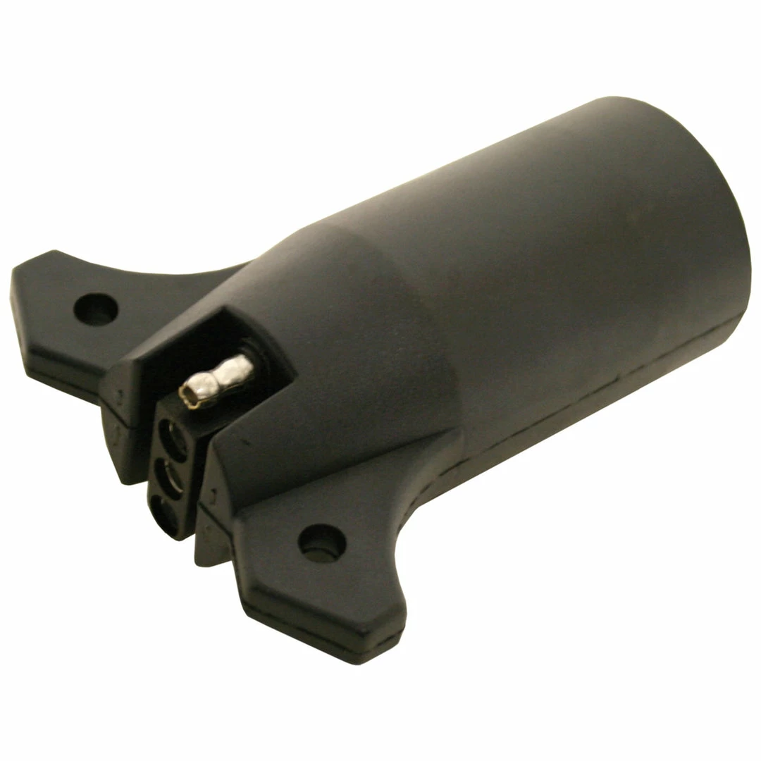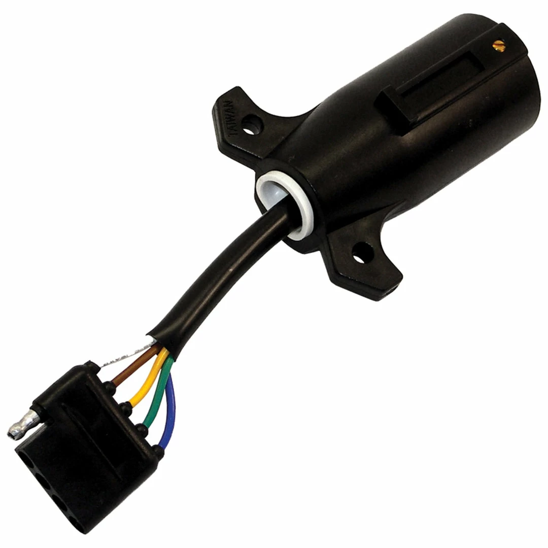 Plug-in converter for use with 4 or 5 pin connectors. Available with or without lead. Connect your round vehicle socket to the flat harness on your trailer.