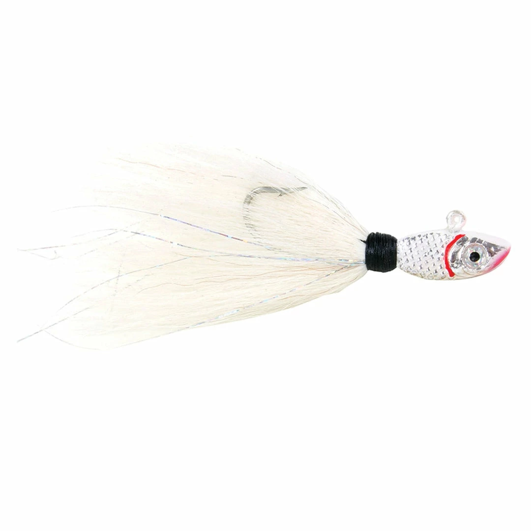 These jigs are meant to be seen and heard. An internal 7 mm pyrex rattle brings fish to the lure. Hand-tied, multi-colored, premium bucktail with glo trailer and epoxy coated thread is another attractant. Custom head shape features gill plates and recessed eye sockets. Scaled, holographic, multi-color paint with 3D eyes and a UV clear coat finish provide a realistic look. Made with Mustad 32786 black nickel hook.