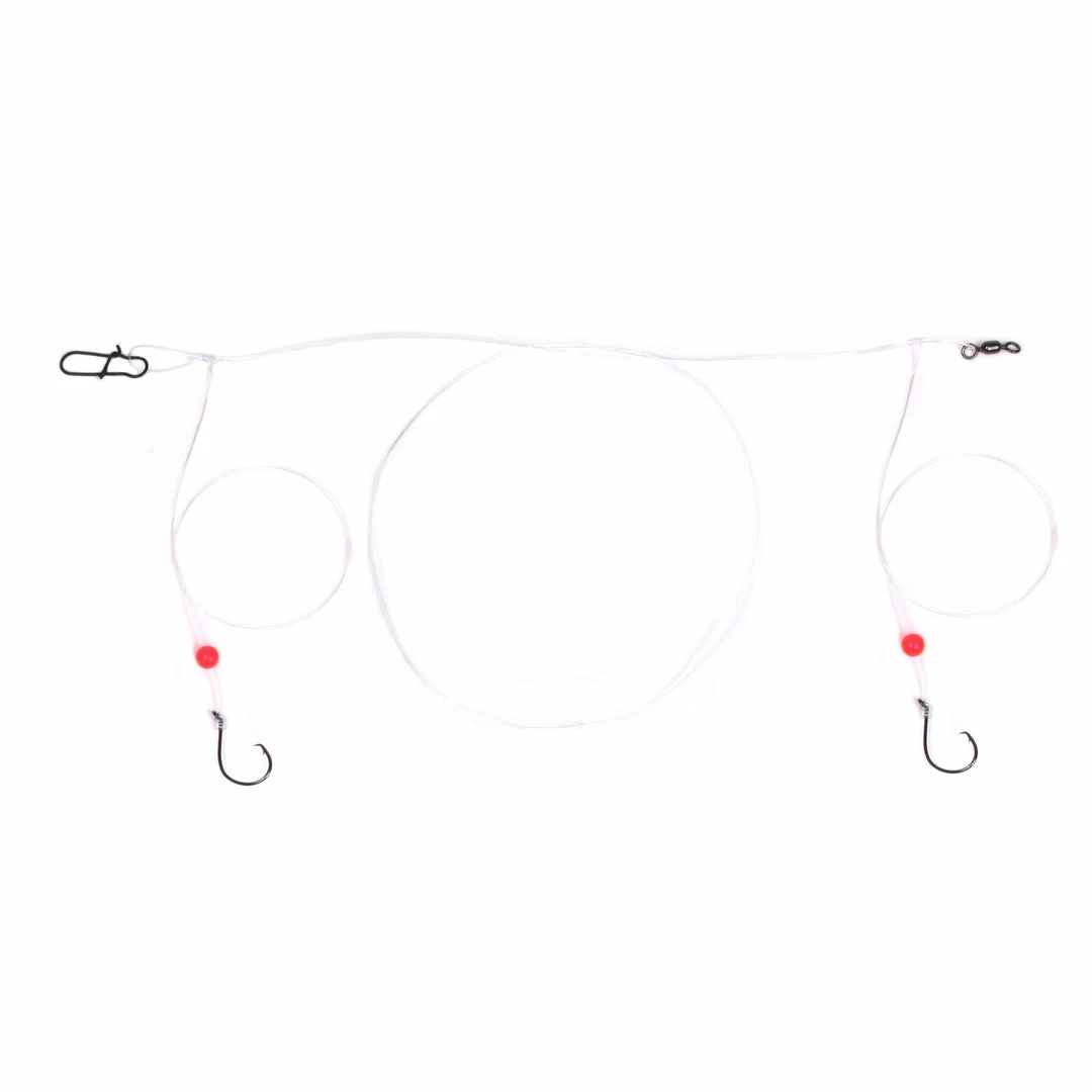 Double drop circle hook rigs tied with fluorocarbon featuring Lazer Sharp by Eagle Claw circle hooks. Available with #2 circle hooks with red and yellow floats or #1 circle hooks and red beads.