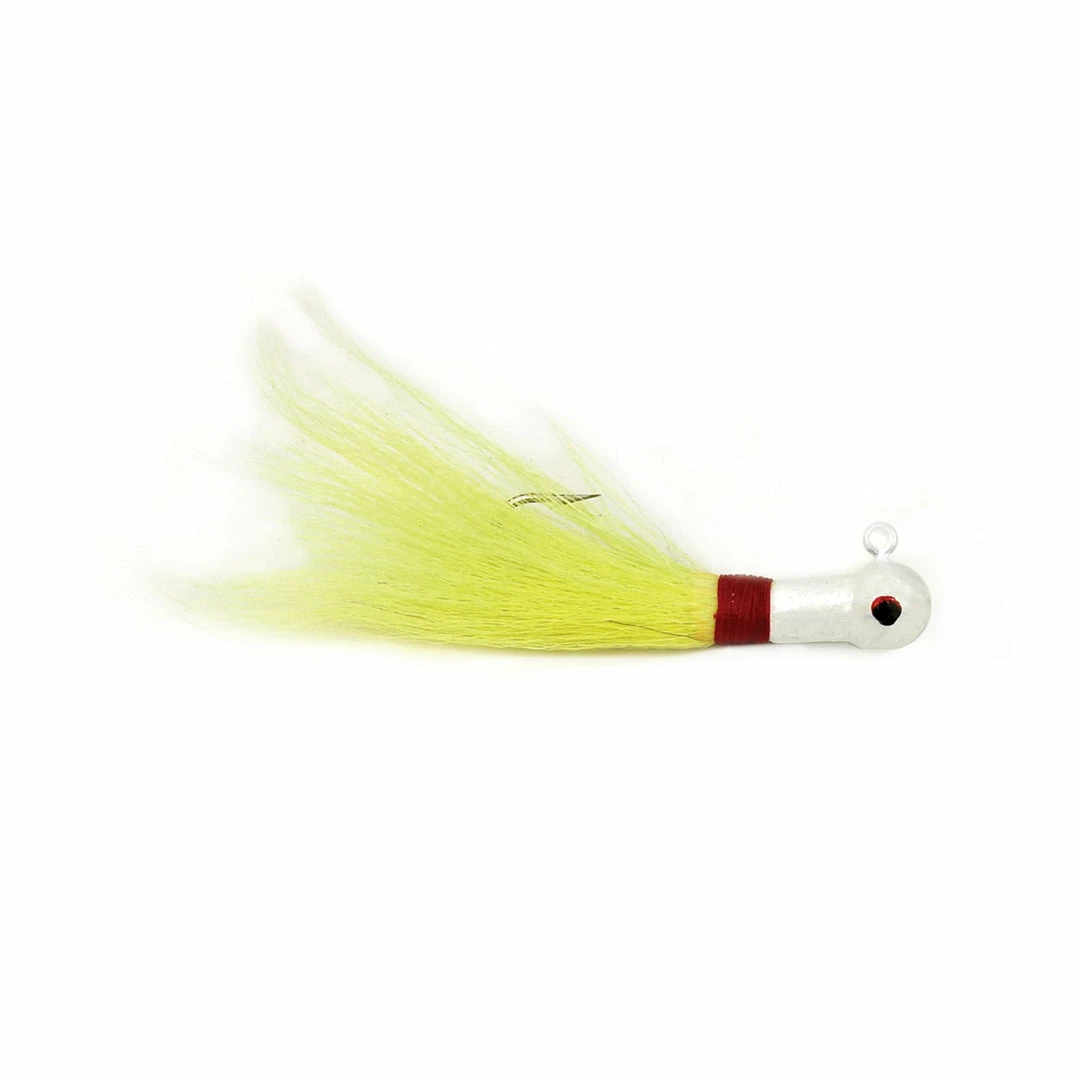 This popular jig, sometimes called a “Bugeye Jig”, is available in several colors and sizes. Tied with natural bucktail on saltwater hooks.