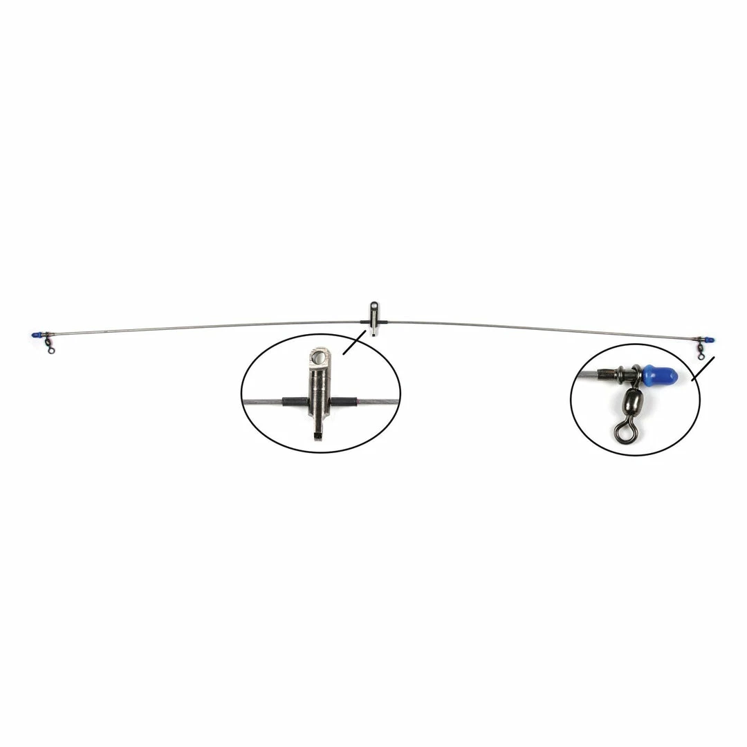 This titanium bar is rigged with a custom drilled “heavy swivel” in the center and stainless steel swivels on both ends. The titanium bar is 30″ wide and allows for three drop lines.