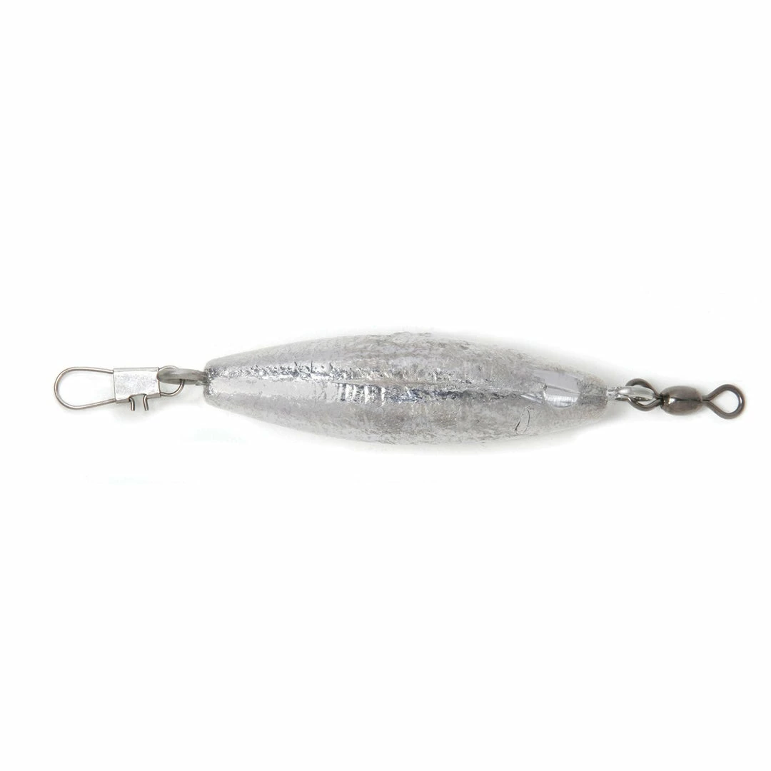 Lead trolling sinkers have a brass eye molded in each end. The ‘470’ series has a #7 crane barrel swivel on one end and a #3 interlock snap on the other.