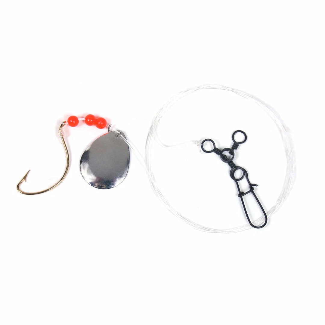 Tied with 2/0 widegap Mustad hook, beads, and spinner with 3-way swivel and snap.