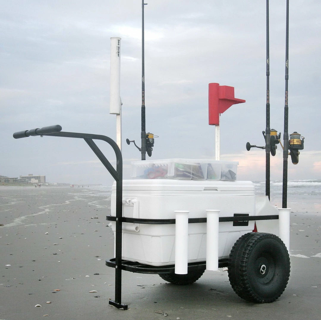 Easily haul all of your fishing gear or beach gear to the water’s edge. This versatile cart features 7 durable PVC rod and accessory holders and the capability to hold up to a 54qt. cooler. Galvanized steel construction with tough powder coat finish protects cart from the elements. Wide surface plastic wheels allow for smooth rolling. Easy assembly with included tools. Internal Cart Dimensions – 34″ x 14.5″ x 7″