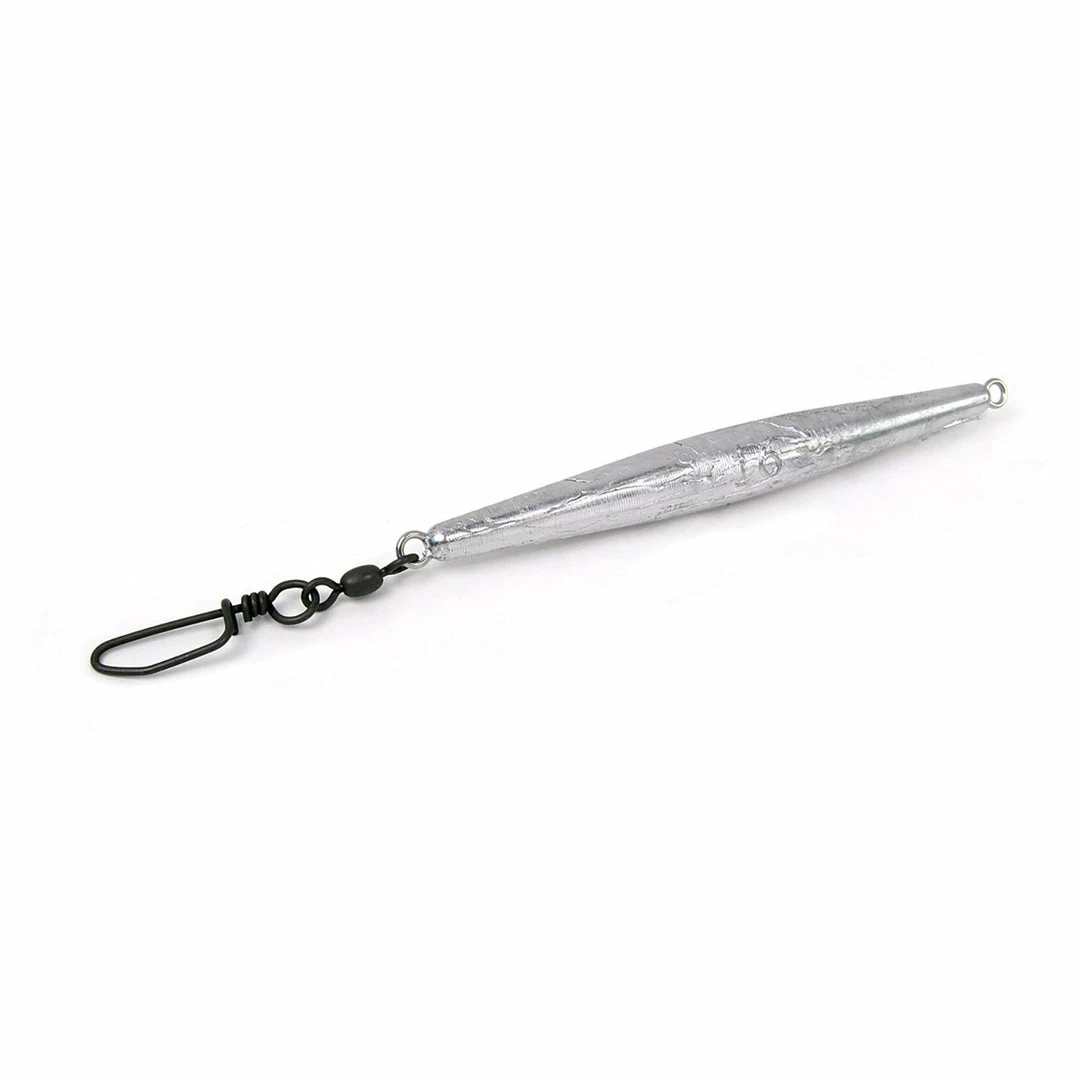 Slim, cigar shaped sinker gets down where the big fish live. One end has a 4/0 Coastlock snap swivel and the other has a brass eye.