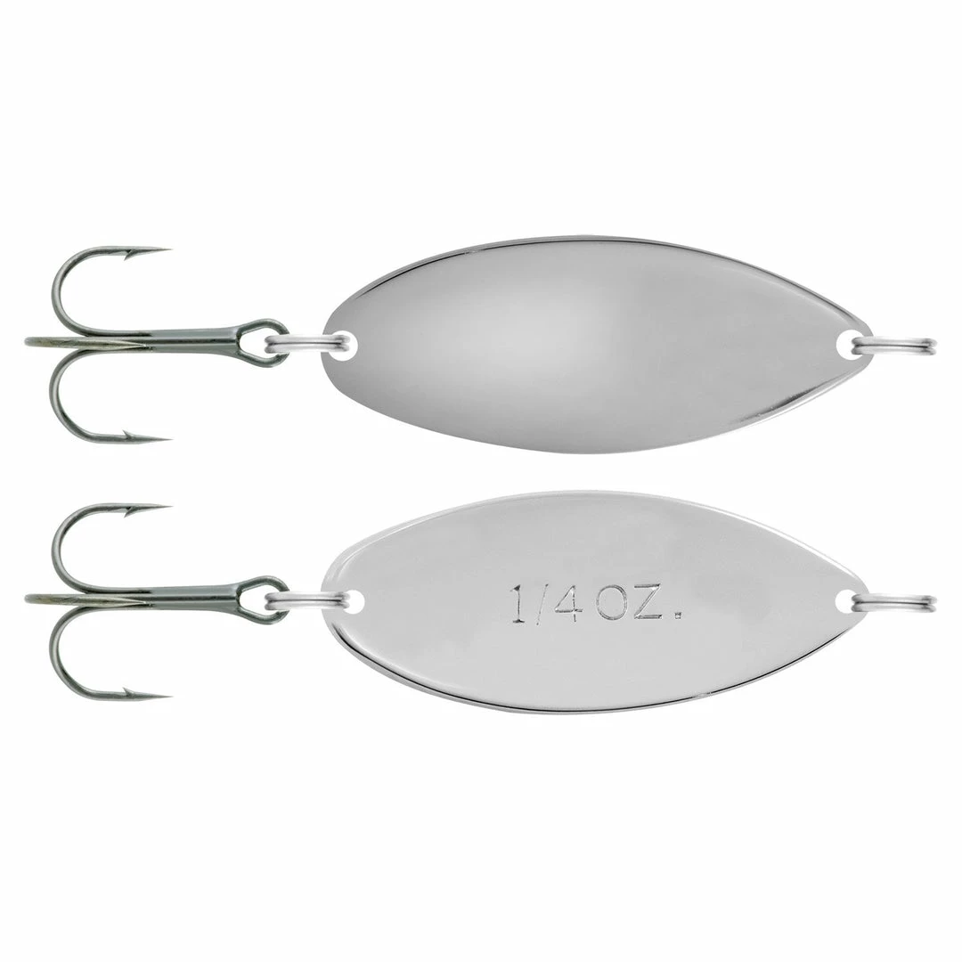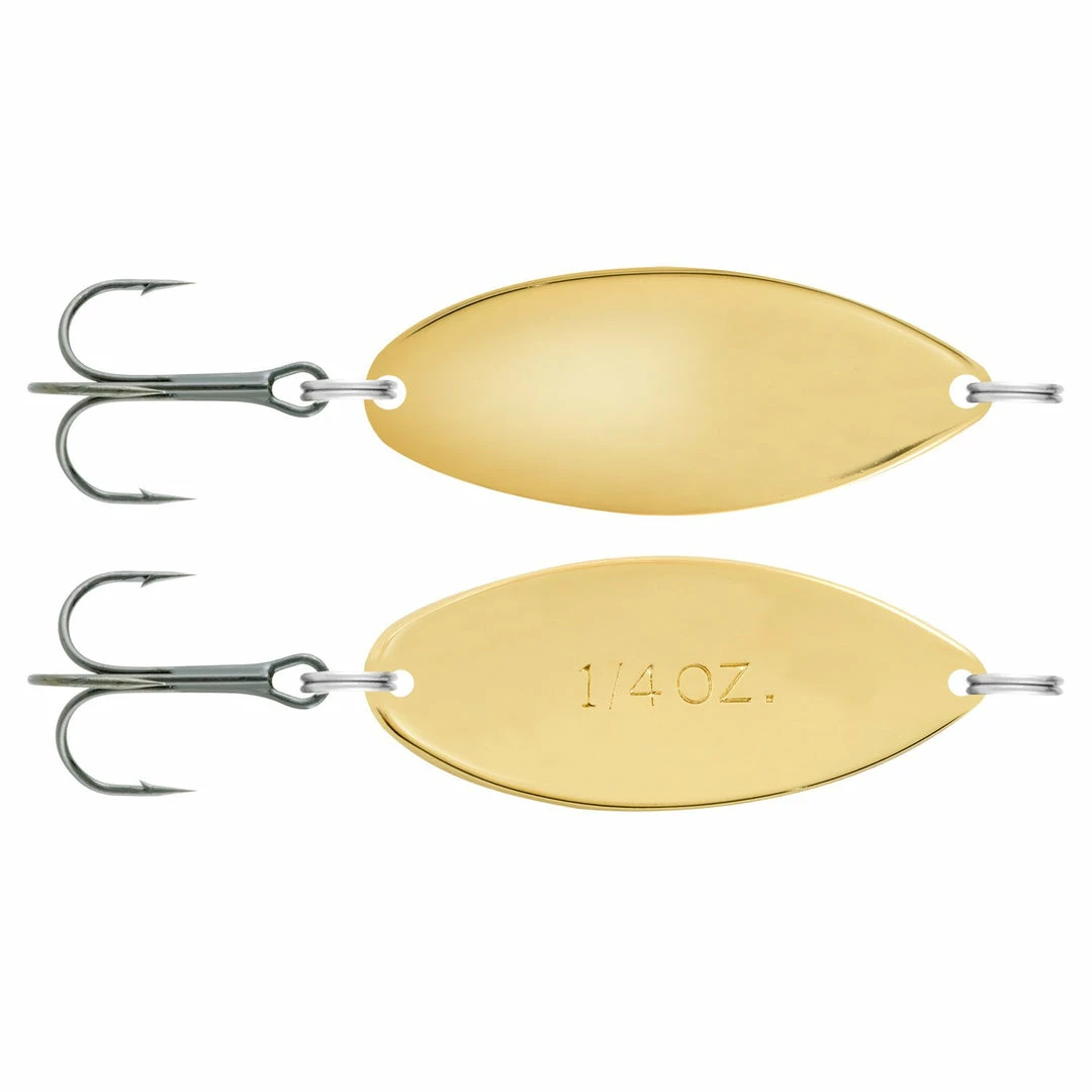 Wide wobbling action and flash, spoon body is 100% brass to cast far and run deep.