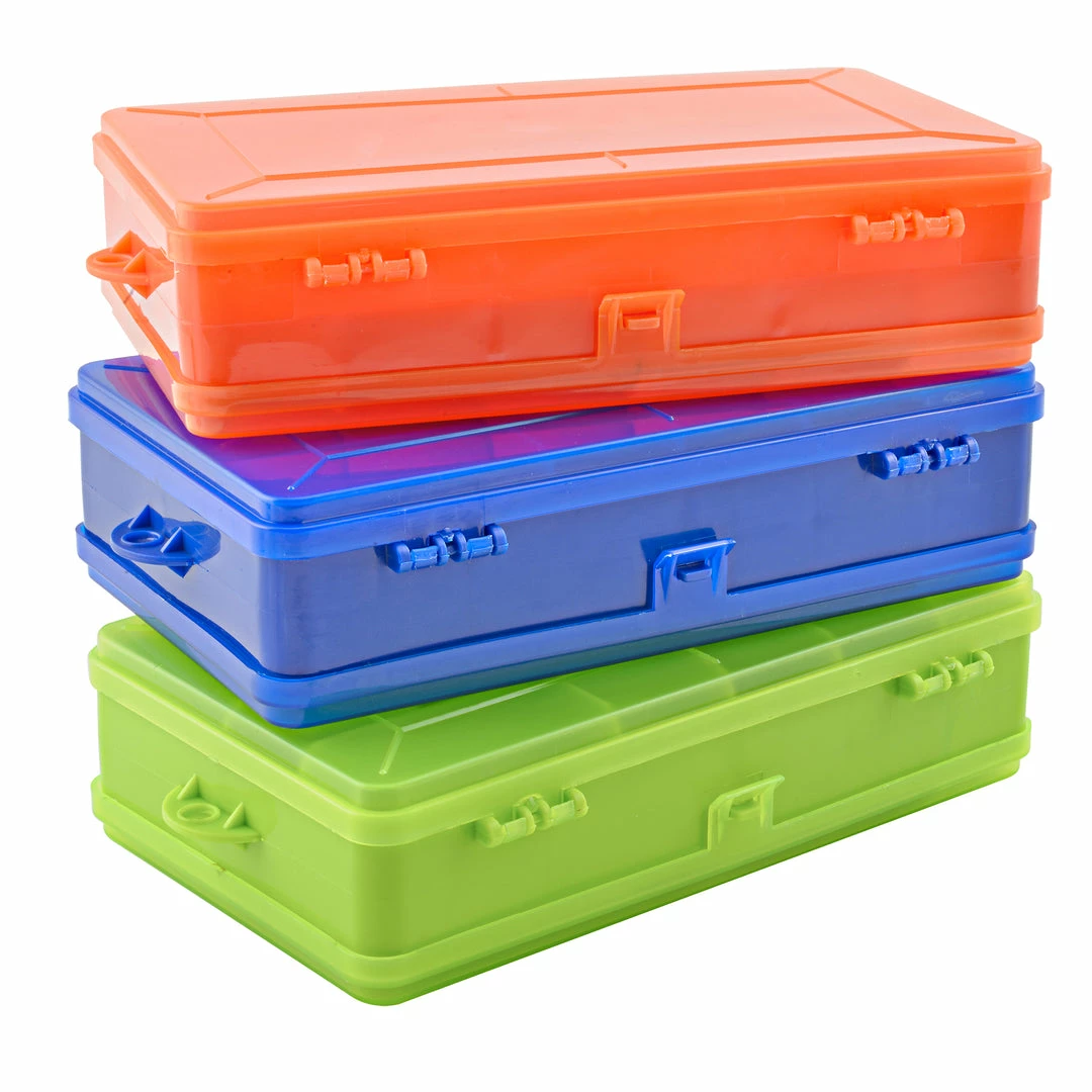 Translucent plastic multi-compartment fishing and all-purpose utility boxes feature latching covers to keep contents from spilling.